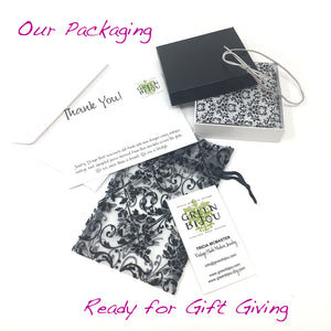 Your item will arrive in our signature damask packaging. Depending on the size of the item, it will either come in a beautiful and reusable organza bag or a black gift box with damask tissue. Both options are perfect for gift giving! Each piece comes with a description card indicating what was used in the design.