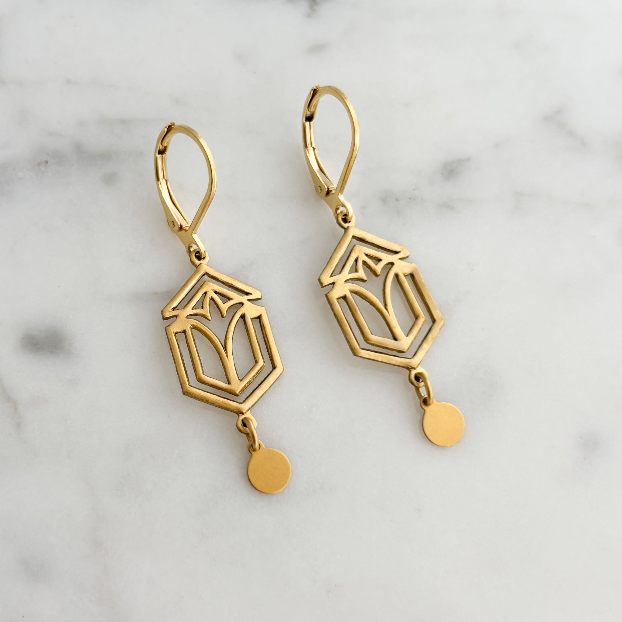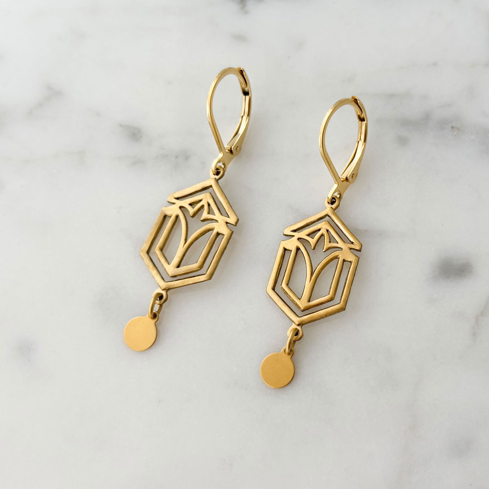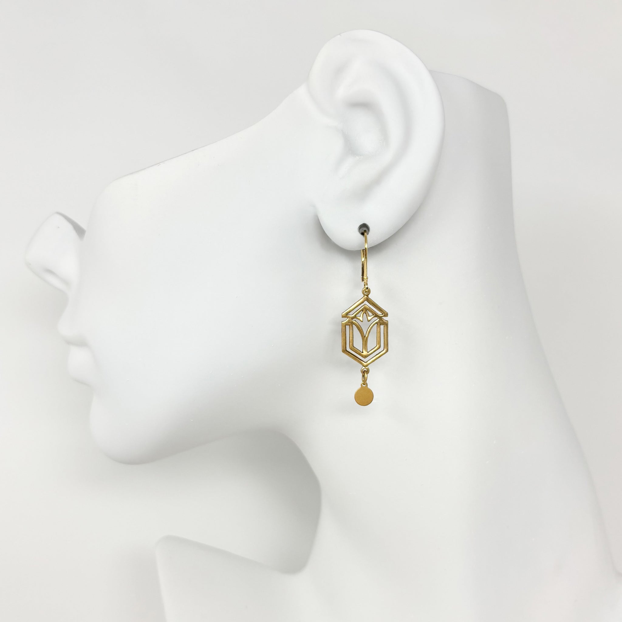 BRYCE Art Deco gold tone pendants and disc dangle earrings